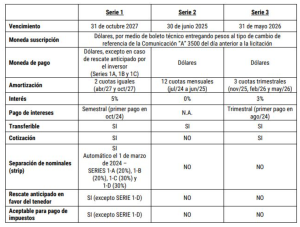 - ¿Cómo será el esquema de cobro de los bonos? El BCRA cancelará tanto la amortización del capital como los intereses (de corresponder) en dólares. Asimismo, la serie 1 y 3 tendrán un mercado secundario, es decir que una vez suscripto por los importadores, estos los podrán vender en dólares, a cualquier persona física o jurídica, al precio que el mercado secundario establezca. Otra alternativa sería transferir los bonos a una paridad de 100% al acreedor, y cancelar la deuda a ese valor.